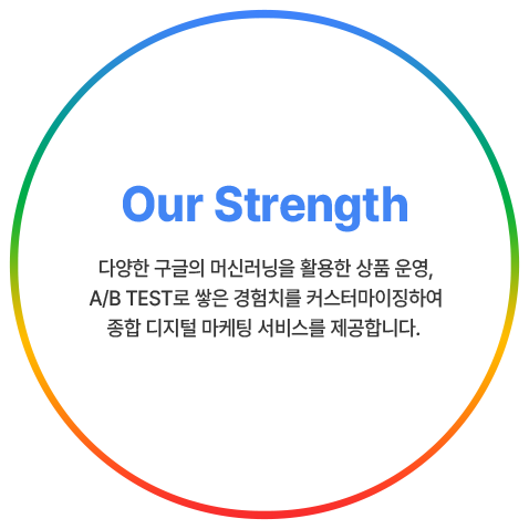 구글과의 정기적인 컨설팅과 다양한 미팅을 통해 빠른 신규 상품 업데이트와 내부 구글 전문가를 통한 성공적인 구글 캠페인 노하우 지원이 가능합니다.